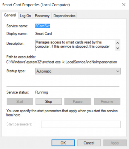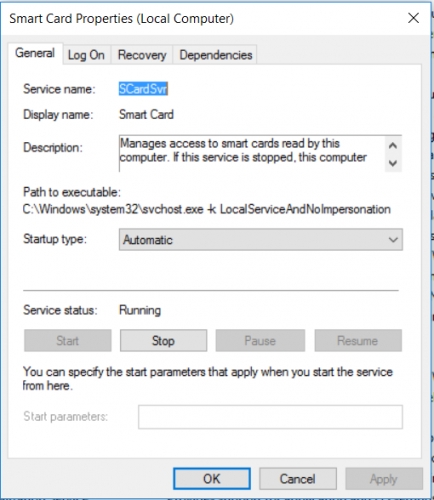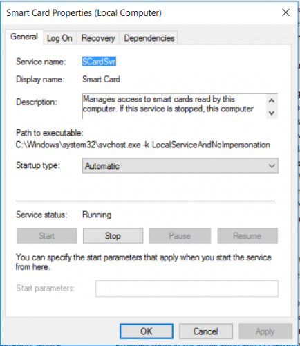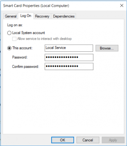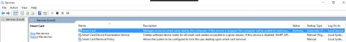 2. The Smartcard service is not logged on as a 'Local Service'.